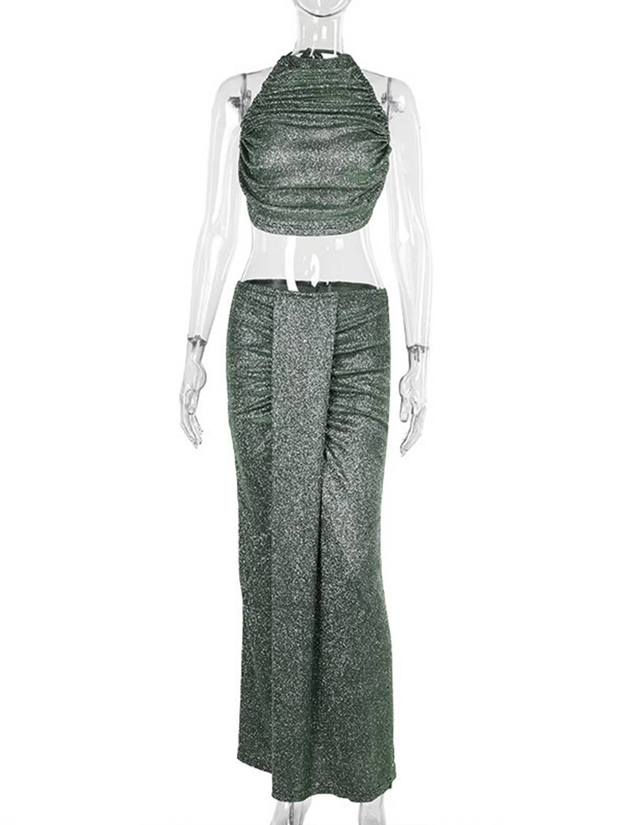 Découvrez l'équilibre parfait entre matière, coupe et fonctionnalité avec Cocolii ensemble robe licou à fines brides dos nu sans manches hauts longue jupe femme décontracté deux pièces | KONF.