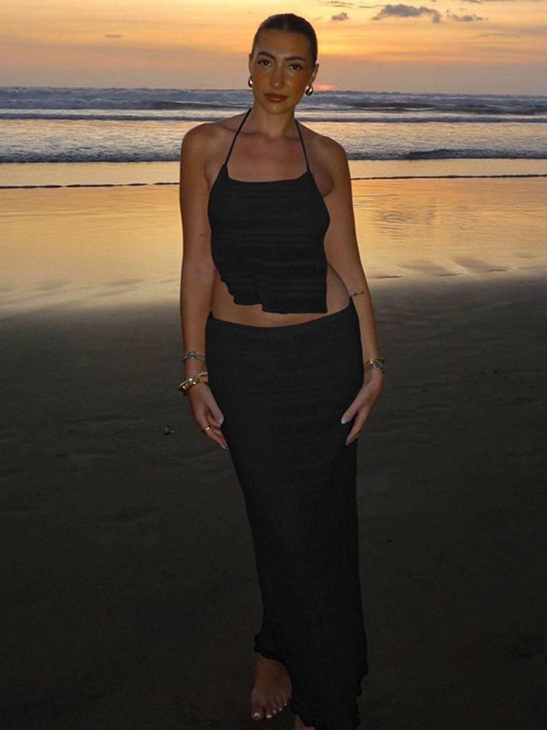 Découvrez l'équilibre parfait entre matière, coupe et fonctionnalité avec Cocolii tenue ensemble avec longue jupe mousseline dos nu licou sans manches débardeur robe femme bohème décontracté deux pièces | KONF.